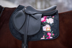 Podsedlová podložka v černé barvě s červenými pivoňkami. Charakteristická jemná saténová záře DotiBel obohacená o elegantní povrchovou úpravu: šňůrka a odznak s kovovým logem dodávají podložce konečný vzhled. Tvarovaný, anatomický tvar a upevnění obvodových popruhů zajišťují dokonalé uchycení pod sedlem.