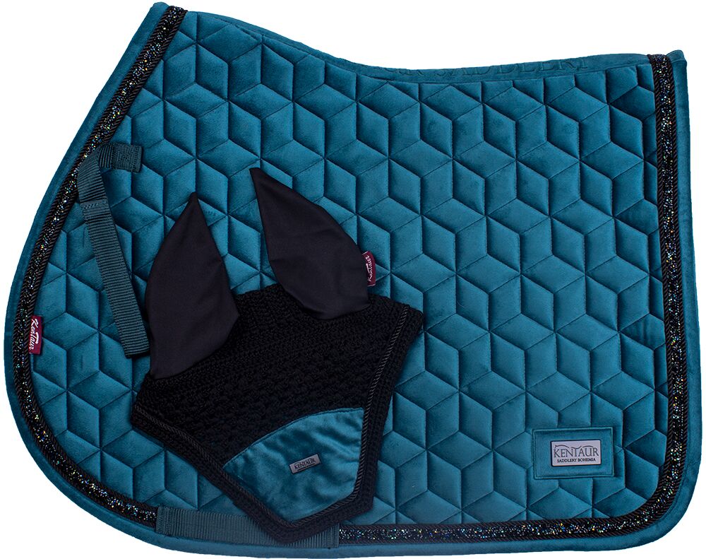 Sametová podsedlová dečka s novým vzorem prošívání v sadě s náušníky. Ozdobný lem s kamínky a černý plíšek s logem Kentaur. Spodní strana z rychleschnoucí HI-TECH síťoviny.